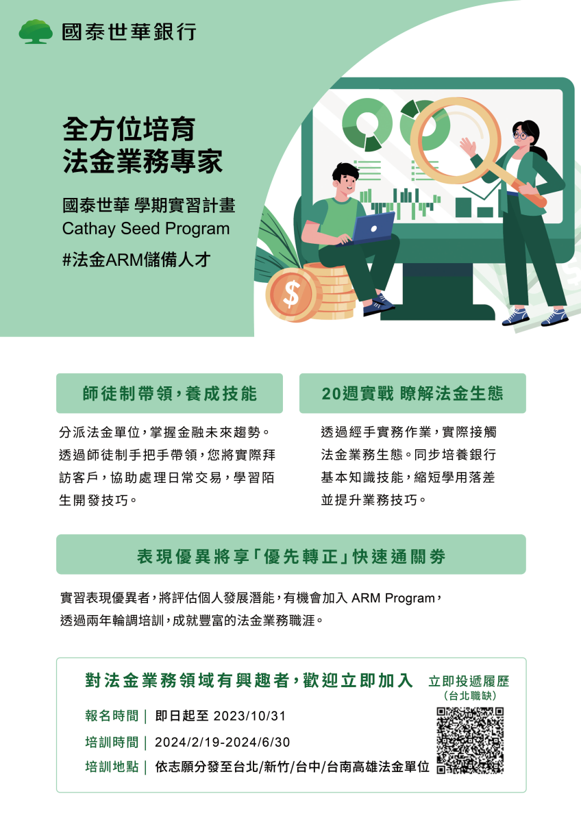 為讓學生能夠提前於在學期間瞭解法金業務工作內容,本屆CSP擴大舉辦法金單位實習至全台地區,